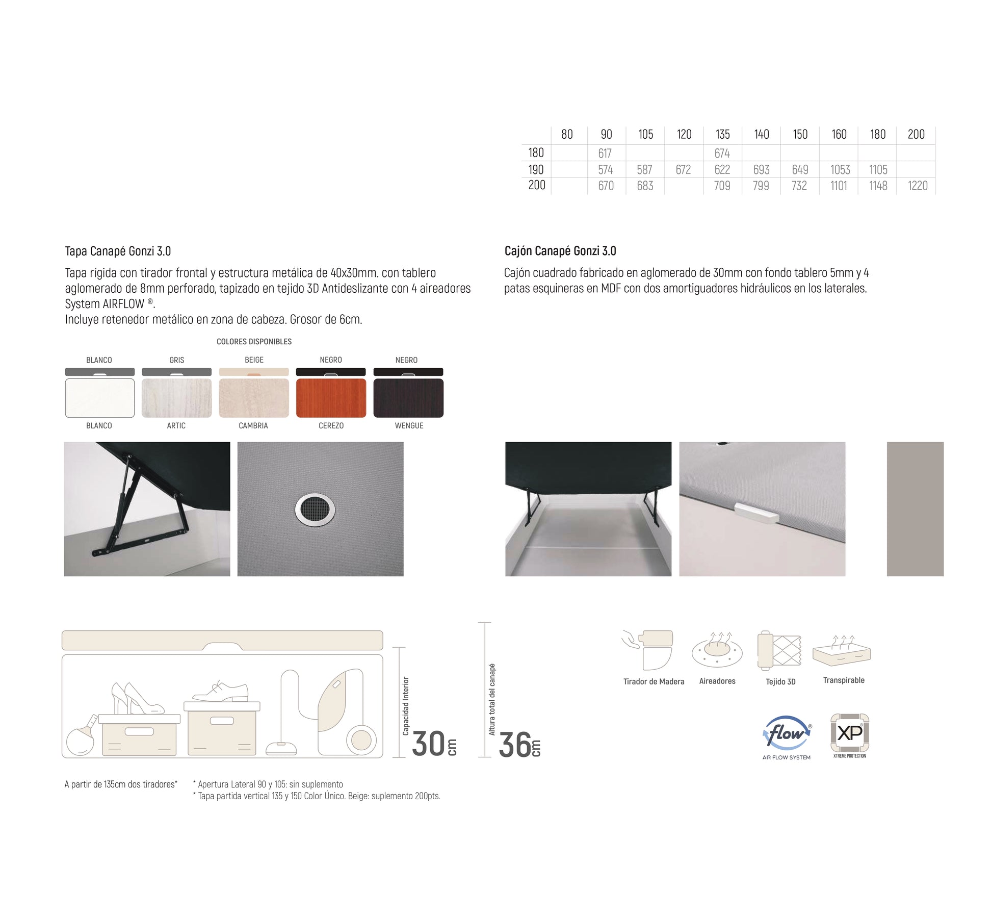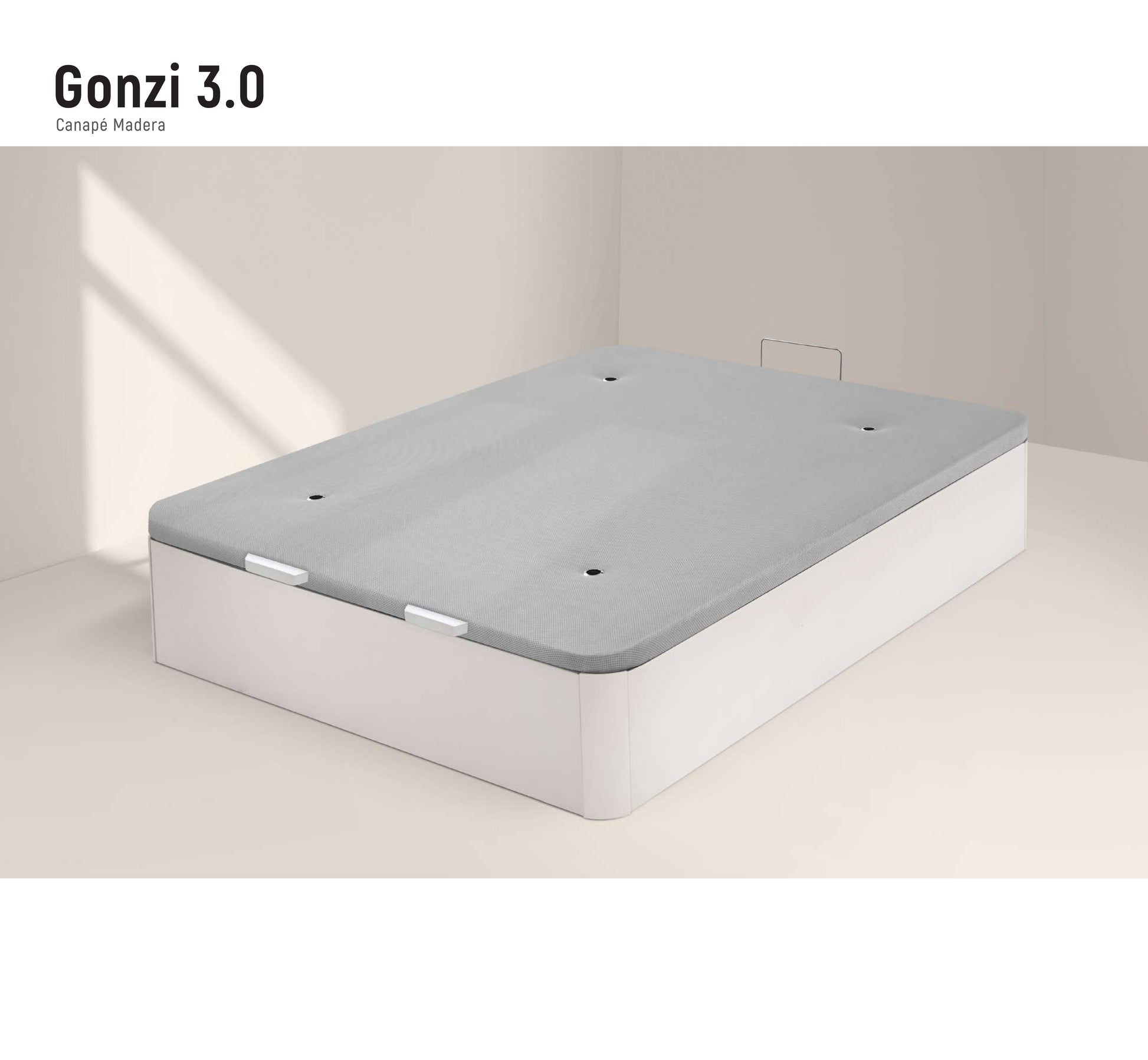 El Canapé Gonzi 3.0 combina una estructura resistente en aglomerado de 30 mm con una tapa de metal y tablero perforado, tapizada en tejido 3D antideslizante y equipada con 4 aireadores System AIRFLOW® para una ventilación óptima. Su diseño de apertura frontal o lateral incluye retendedor metálico y ofrece una gran capacidad de almacenamiento.