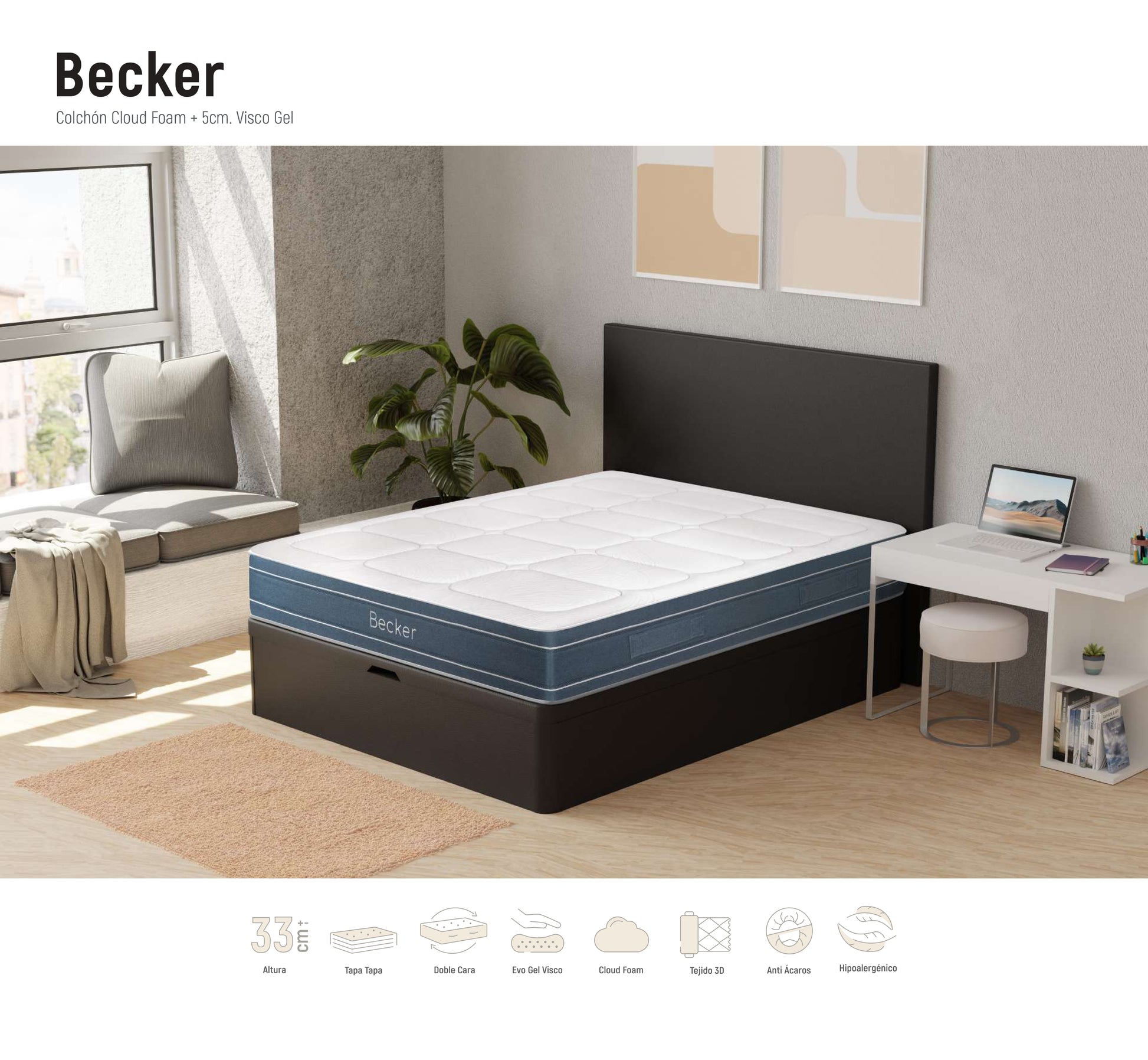 El Colchón Becker ofrece un confort envolvente con una base de CloudFoam® de 19 cm (densidad 28 kg/m³) y capas de Visco Gel en ambas caras para una sensación fresca durante la noche. Su diseño doble cara “tapa a tapa” prolonga la vida útil del colchón y permite rotarlo para mantener un rendimiento uniforme.