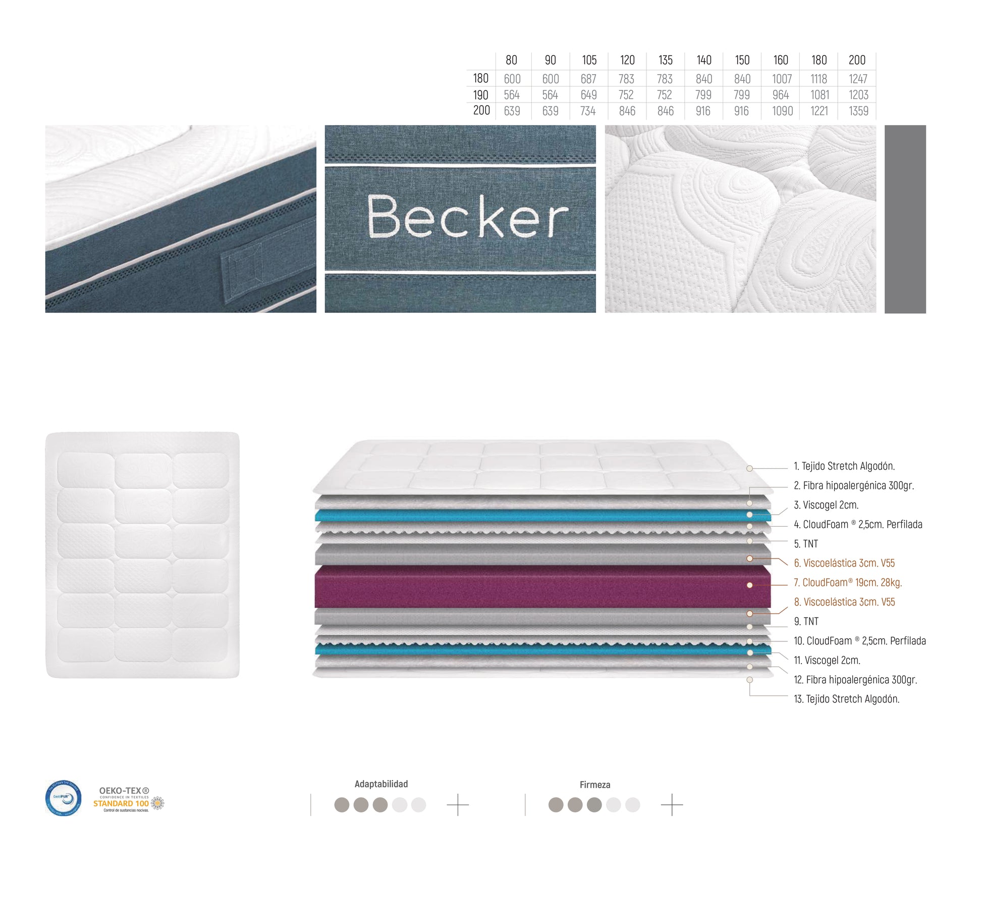 - Cara B (confort fresco inverso): CloudFoam® 2,5 cm perfilada, Visco Gel 2 cm, Fibra hipoalergénica 300 g, Tejido Stretch algodón