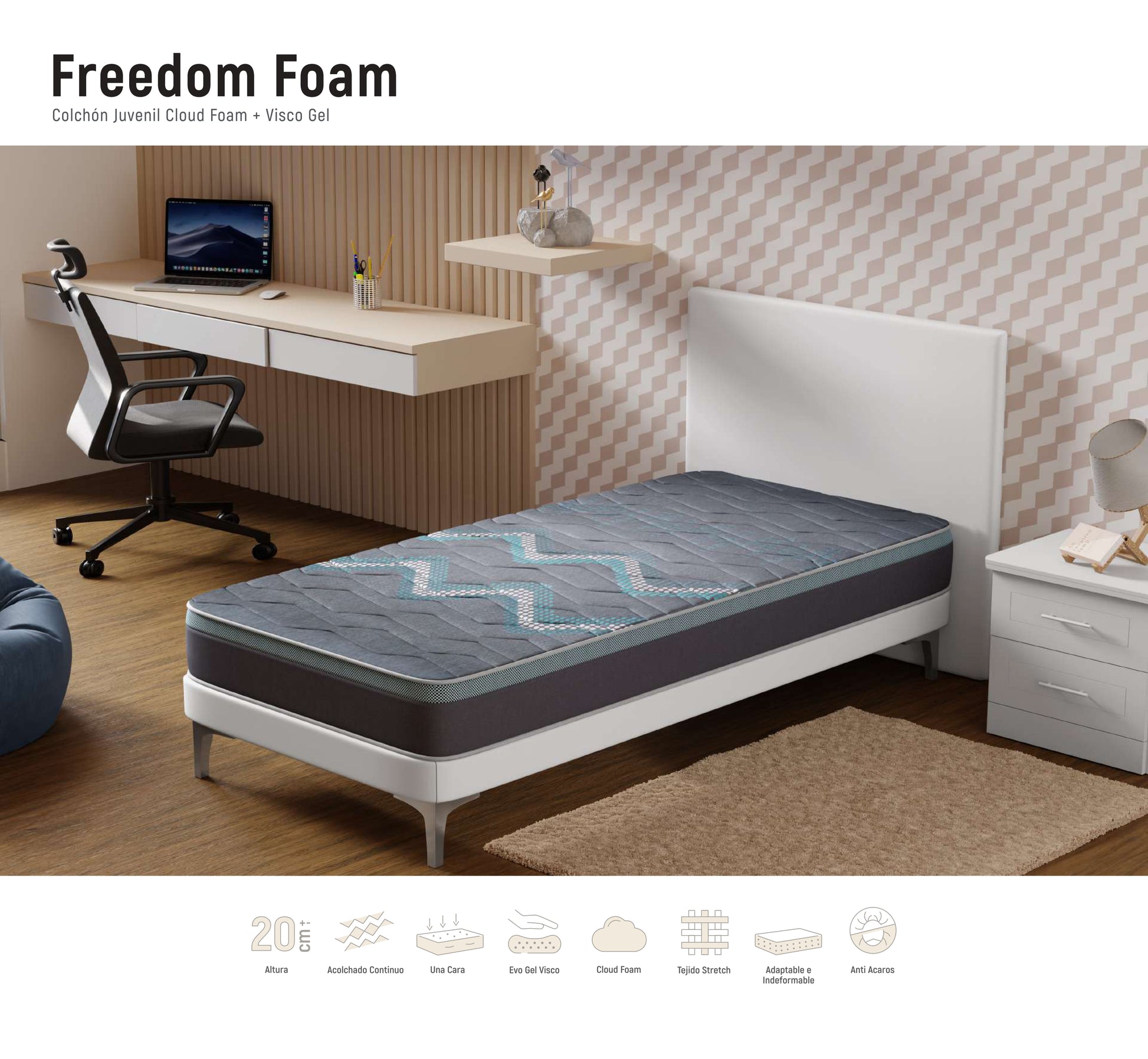 El Colchón Freedom Foam está diseñado para un descanso juvenil cómodo y duradero, combinando la adaptabilidad de CloudFoam® con la frescura del Visco Gel. Su estructura de una sola cara reduce el mantenimiento, ofreciendo soporte estable y una acogida agradable.