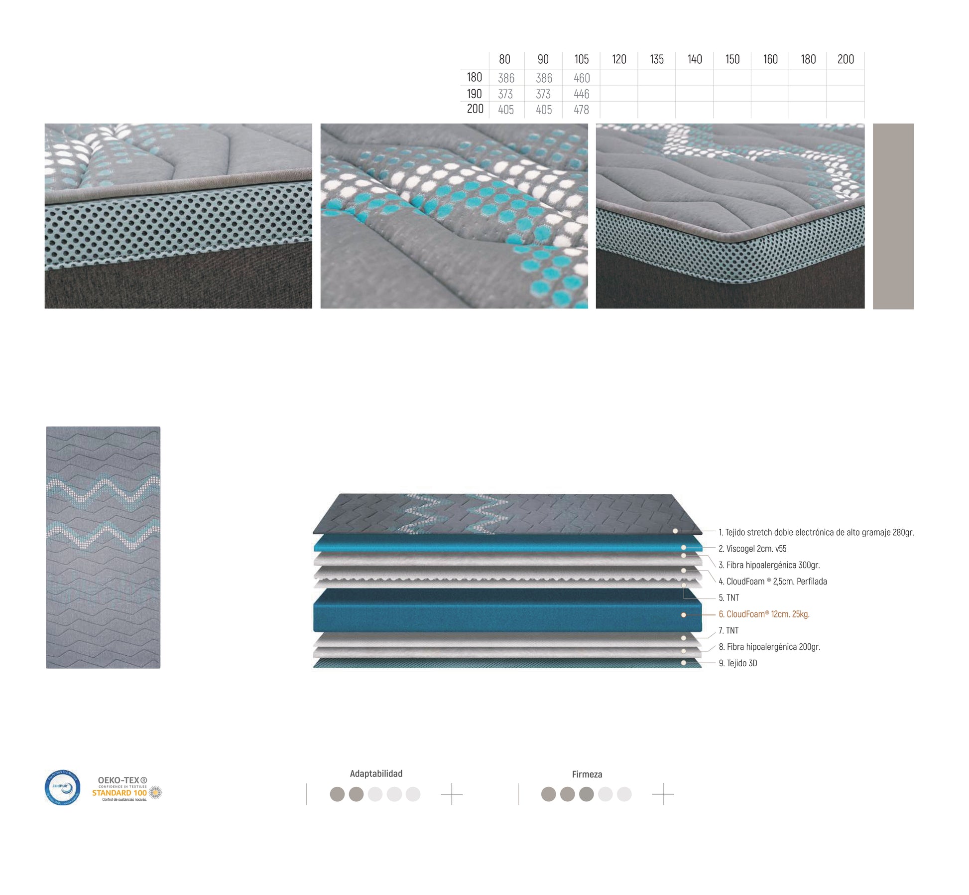 - Cara de confort: Tejido stretch 280 g, fibra hipoalergénica 300 g, Visco Gel 2 cm, CloudFoam® 2,5 cm perfilada, TNT