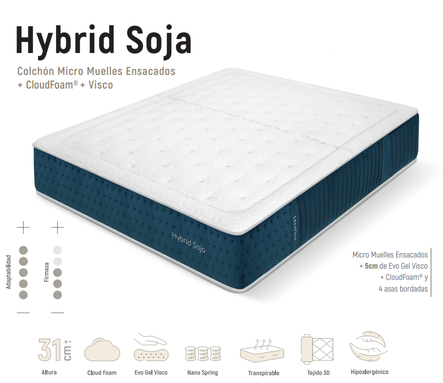El Colchón Hybrid Soja combina la última tecnología de Micro Muelles Ensacados con EvoGel® Visco (5 cm) y CloudFoam® de alta densidad, logrando un descanso ergonómico, fresco y duradero. Su estructura de doble cara tipo “tapa a tapa” ofrece confort equilibrado y gran transpirabilidad.