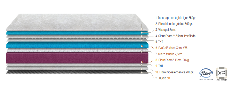 - Núcleo: EvoGel® visco 3 cm (V55), Micro Muelles 2,5 cm, CloudFoam® 19 cm (28 kg/m³)