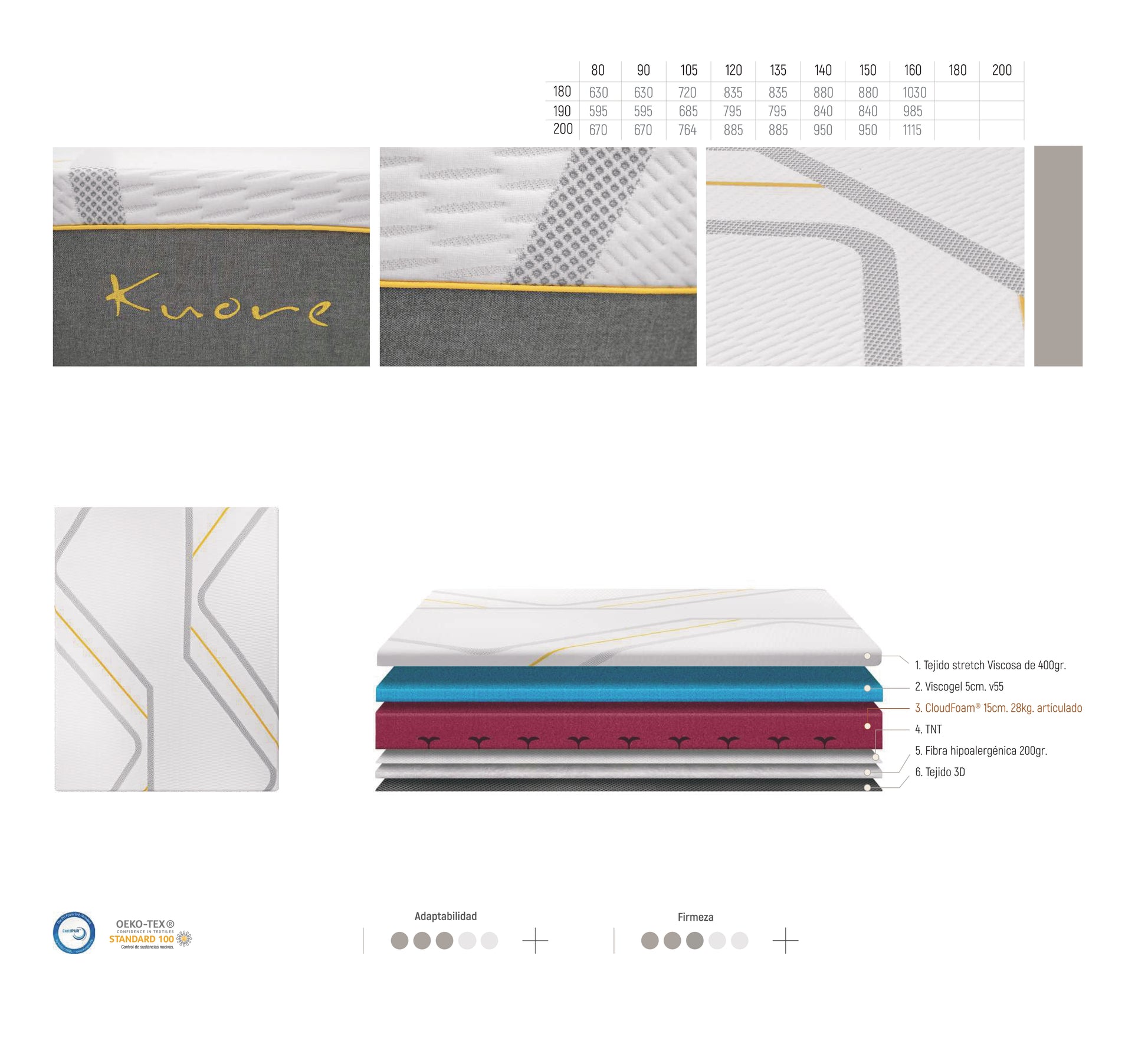 El Colchón Kuore ha sido diseñado para camas articuladas, combinando CloudFoam™ articulado de 15 cm con ViscoGel de 5 cm (V65) para un descanso ergonómico, adaptable y fresco. Su diseño de una sola cara y funda doble facilita el mantenimiento, ofreciendo confort y soporte en cada posición.