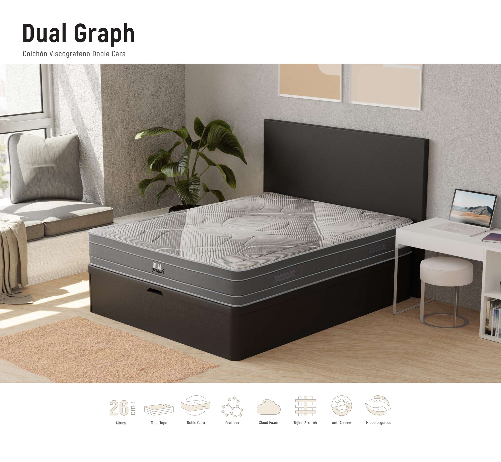El Colchón Dual Graph está diseñado para quienes buscan un descanso fresco, adaptable y duradero, gracias a su combinación de Viscografeno y CloudFoam®. Su estructura de doble cara tipo “tapa a tapa” permite utilizar ambas caras, prolongando la vida útil y ofreciendo diferentes sensaciones de confort.