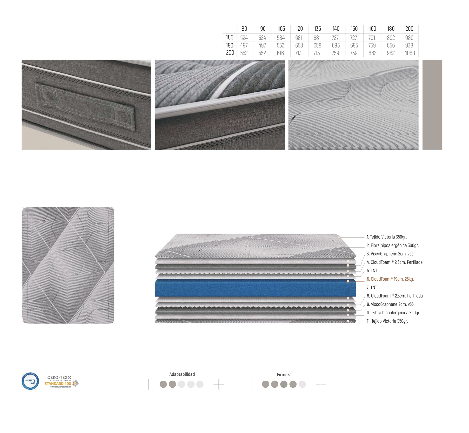 - Cara de confort 2: CloudFoam® 2,5 cm perfilada, Viscografeno 2 cm (V55), fibra hipoalergénica 200 g, tejido Victoria 350 g