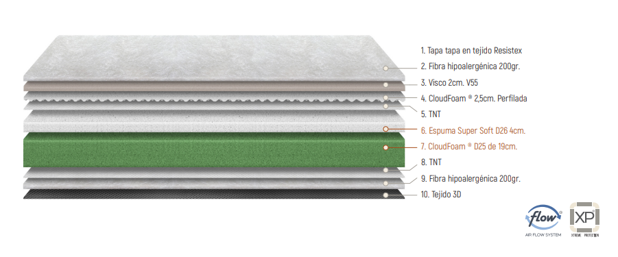 - Capa superior: Tejido Resistex, fibra hipoalergénica 200 g, Viscogel 2 cm V55, CloudFoam® 2,5 cm perfilada