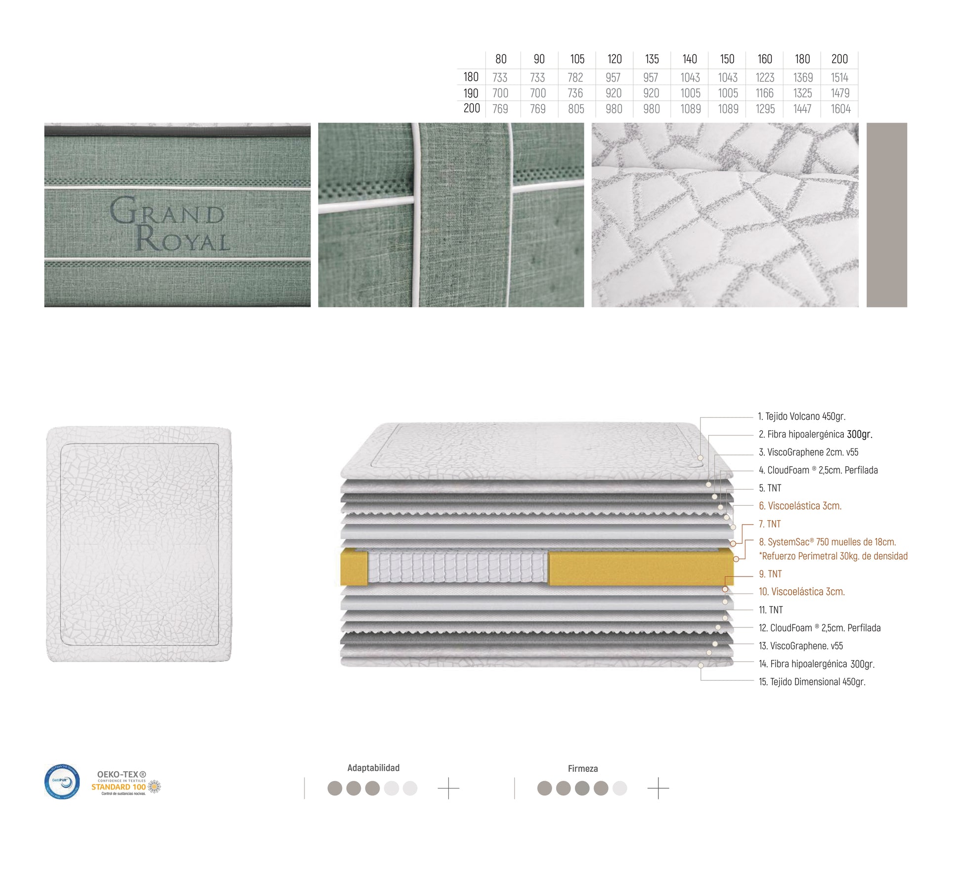 - Cara superior e inferior (idénticas): Tejido Volcano 450g, Fibra hipoalergénica 300g, Viscografene® 2 cm (v55), Cloud Foam® 2,5 cm perfilada, TNT, Viscoelástica 3 cm, TNT