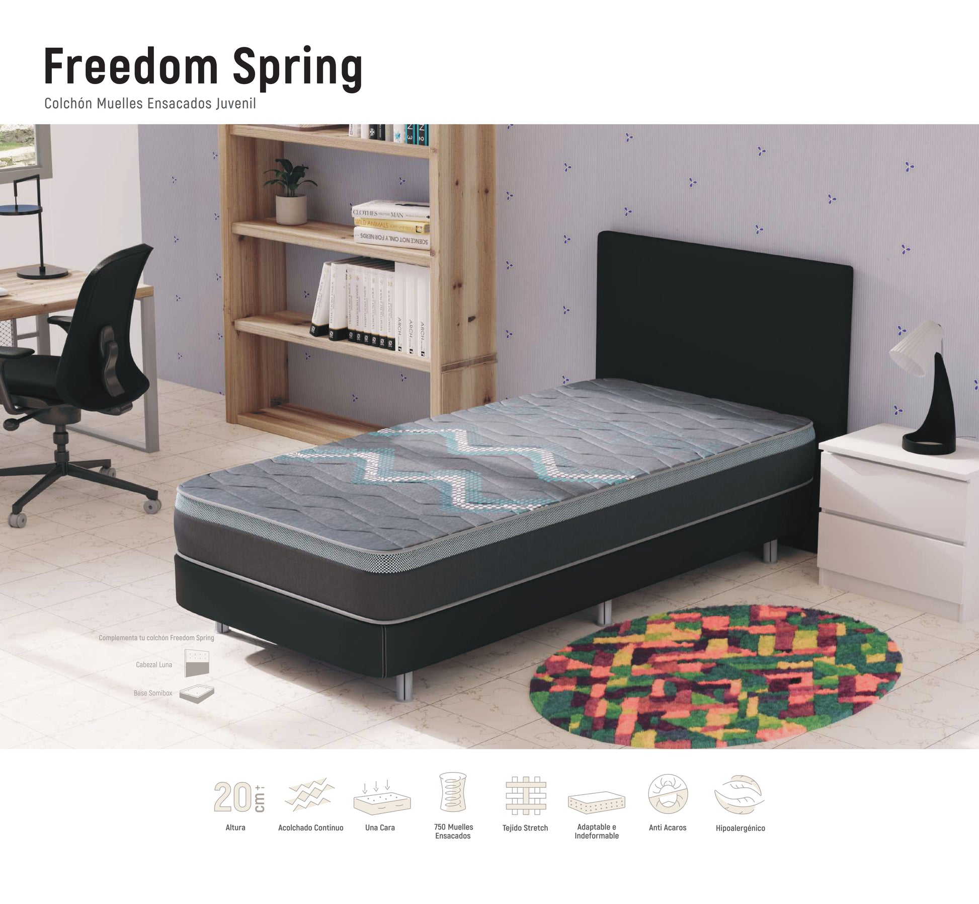 El Colchón Freedom Spring está pensado para un descanso juvenil cómodo y fresco. Combina un núcleo de muelles ensacados de 13 cm (SystemSac®) con refuerzo perimetral de 30 kg/m³ y capas de Visco Gel y espumas técnicas que aportan soporte estable, transpirabilidad y alivio de presión. Su diseño de una sola cara con acolchado continuo facilita el mantenimiento diario.