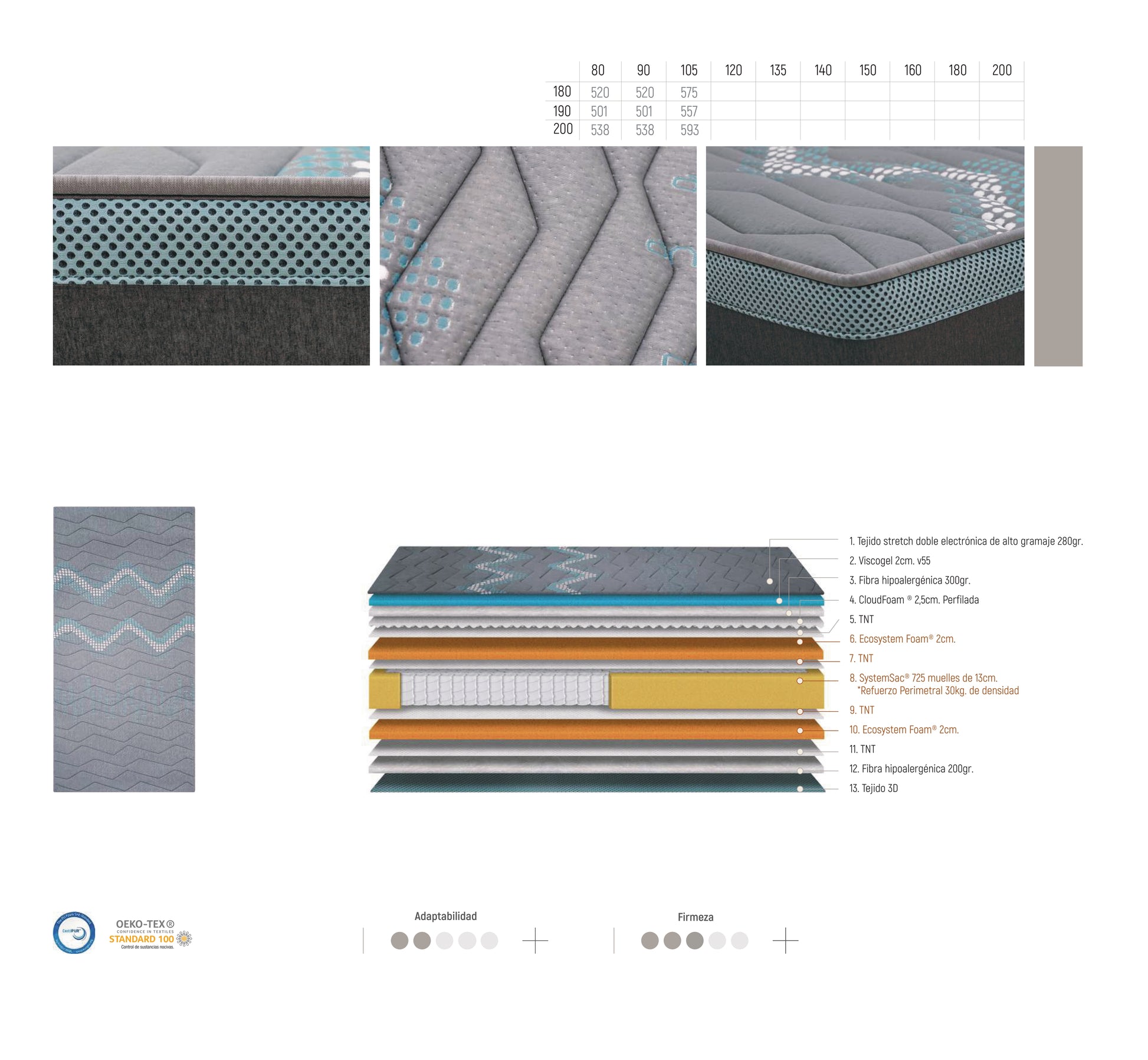 - Cara de confort: Tejido stretch 280 g, Visco Gel 2 cm (v55), Fibra hipoalergénica 300 g, CloudFoam® 2,5 cm perfilada, TNT, Ecosystem Foam® 2 cm, TNT