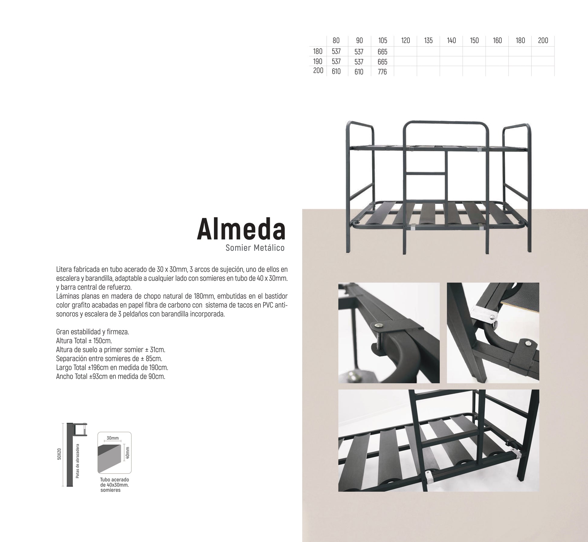La Litera Almeda está fabricada en tubo acerado de 30 x 30 mm con tres arcos de sujeción, uno de ellos en escalera y barandilla, adaptables a cualquier lado. Incorpora somieres en tubo de 40 x 30 mm con barra central de refuerzo para ofrecer máxima estabilidad.