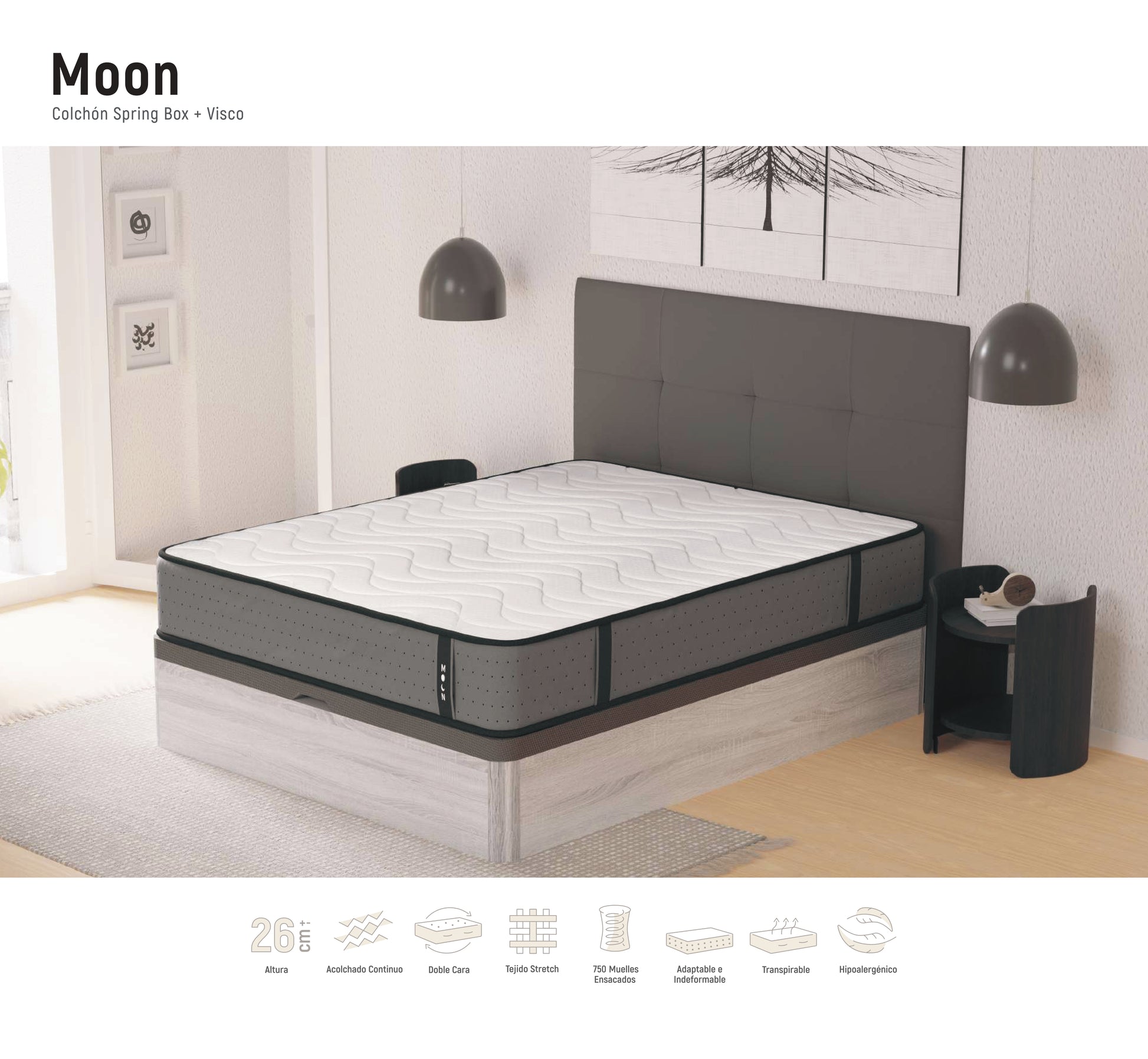 Colchón Moon | Muelles Ensacados + Viscoelástica | 26 cm – Firmeza Media | Doble Cara