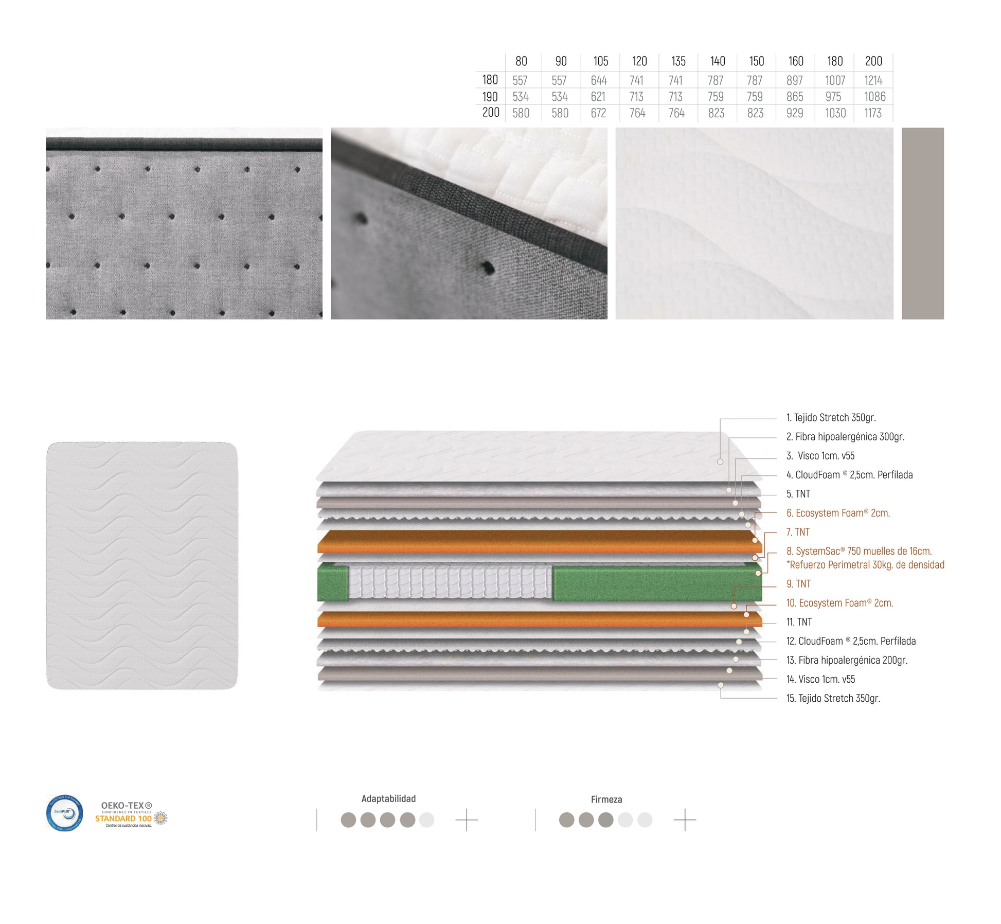 - Núcleo: 750 muelles ensacados (SystemSac®) de 16 cm con refuerzo perimetral de 30 kg/m³